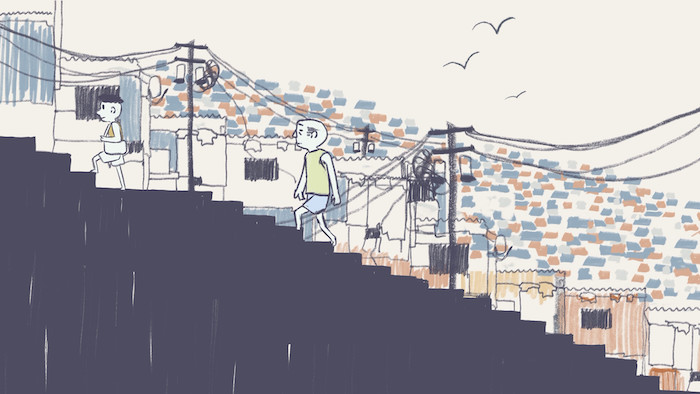 Laughing and Crying (Tumatawa, Umiiyak) is an animated short about a man’s recollection of a bygone afternoon with his grandfather. Together, they wander through their old neighborhood and into the city, tasked with picking flowers for school. Along the way, they play games to pass the time and endure the afternoon heat.